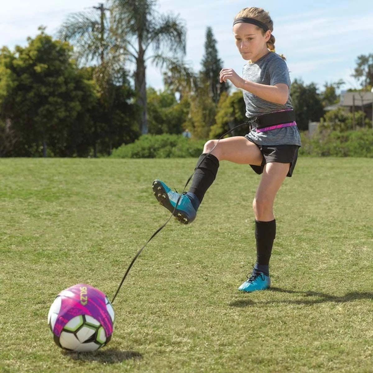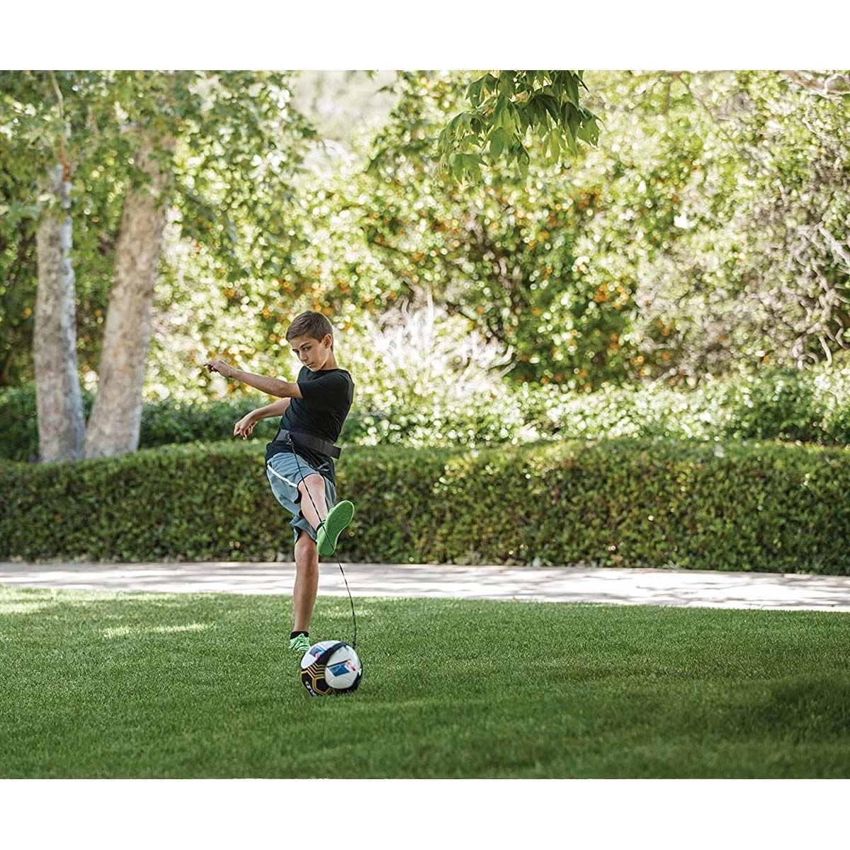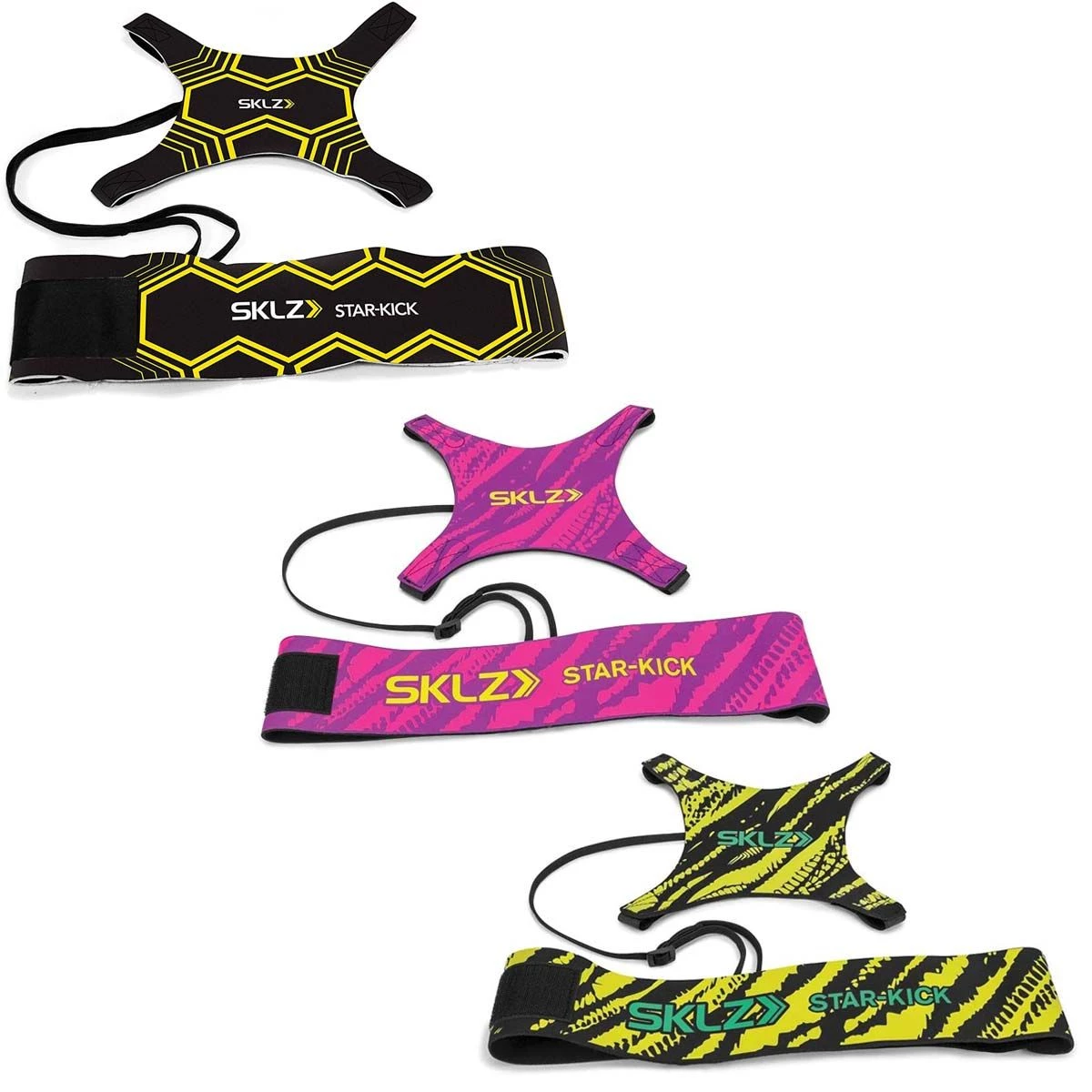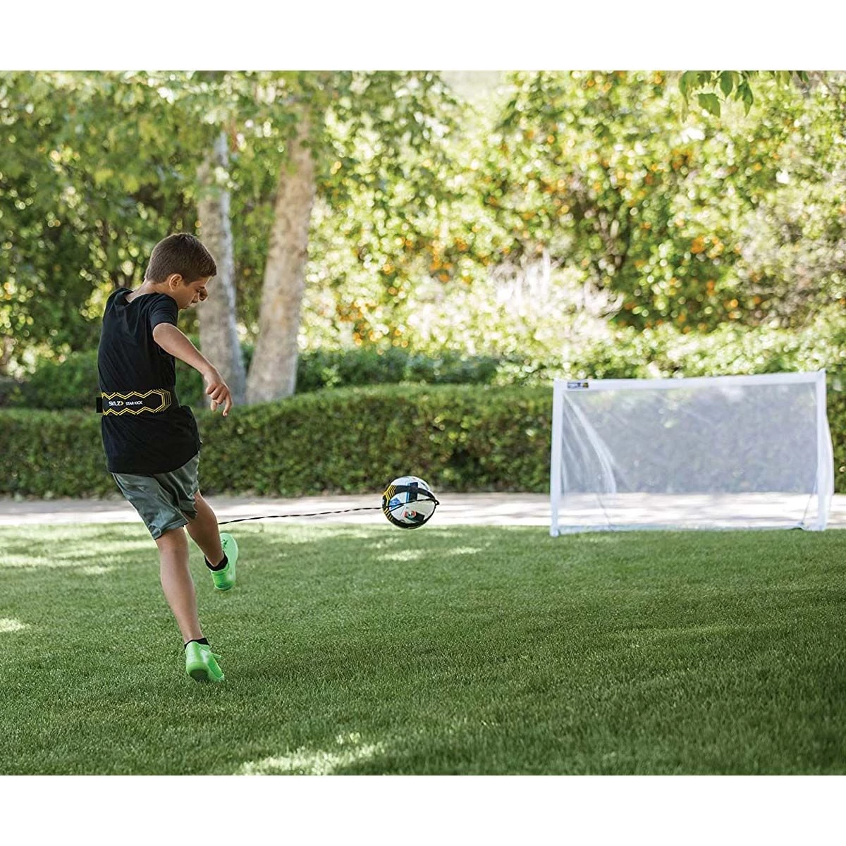 The SKLZ Star-Kick soccer trainer helps young players develop skills like ball control, passing & shooting techniques, and improve ball receiving. This soccer training aid is also effective in improving goalie reflexes and skills like punting. The Star-Kick’s unique design maximizes a player’s training by minimizing the time spent chasing the ball.ย The Star-Kick features a durable tethered waistband that fits most waist sizes, a high-quality adjustable cord that stretches up to 18 ft (5.5 m), and an adjustable neoprene ball glove that fits ball sizes 3, 4 and 5.