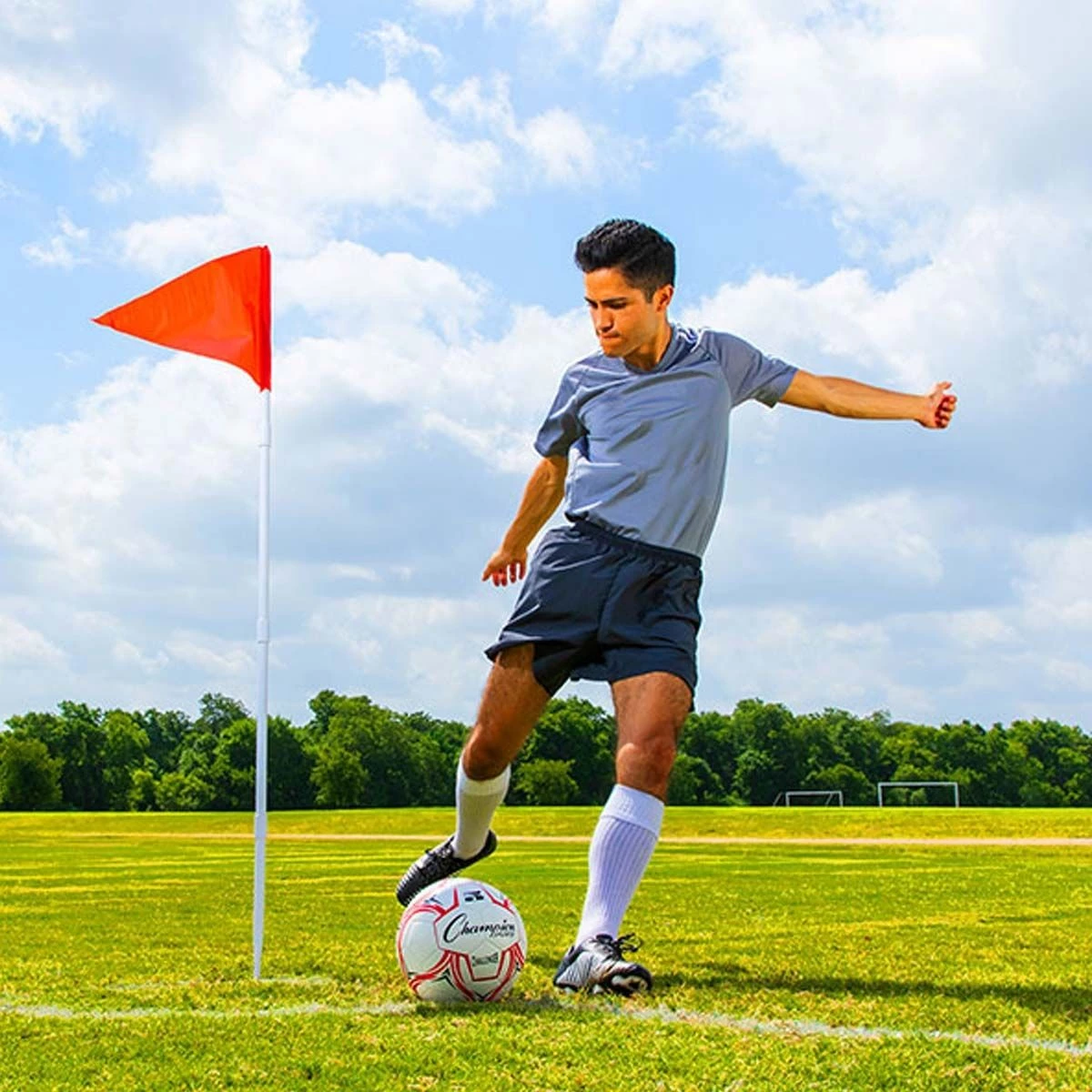 The Champion Sports Fold-A-Flag soccer corner flag system features a set of 4 shock-corded corner flags. The internal shock cord allows the posts to break down in seconds making the dissemble quick and easy. The corner flags are built with sturdy PVC poles that fold quickly and fit in the included carrying pouch. Champion’s Fold-A-Flag corner flags are an excellent choice for those who require portability without compromising quality.
