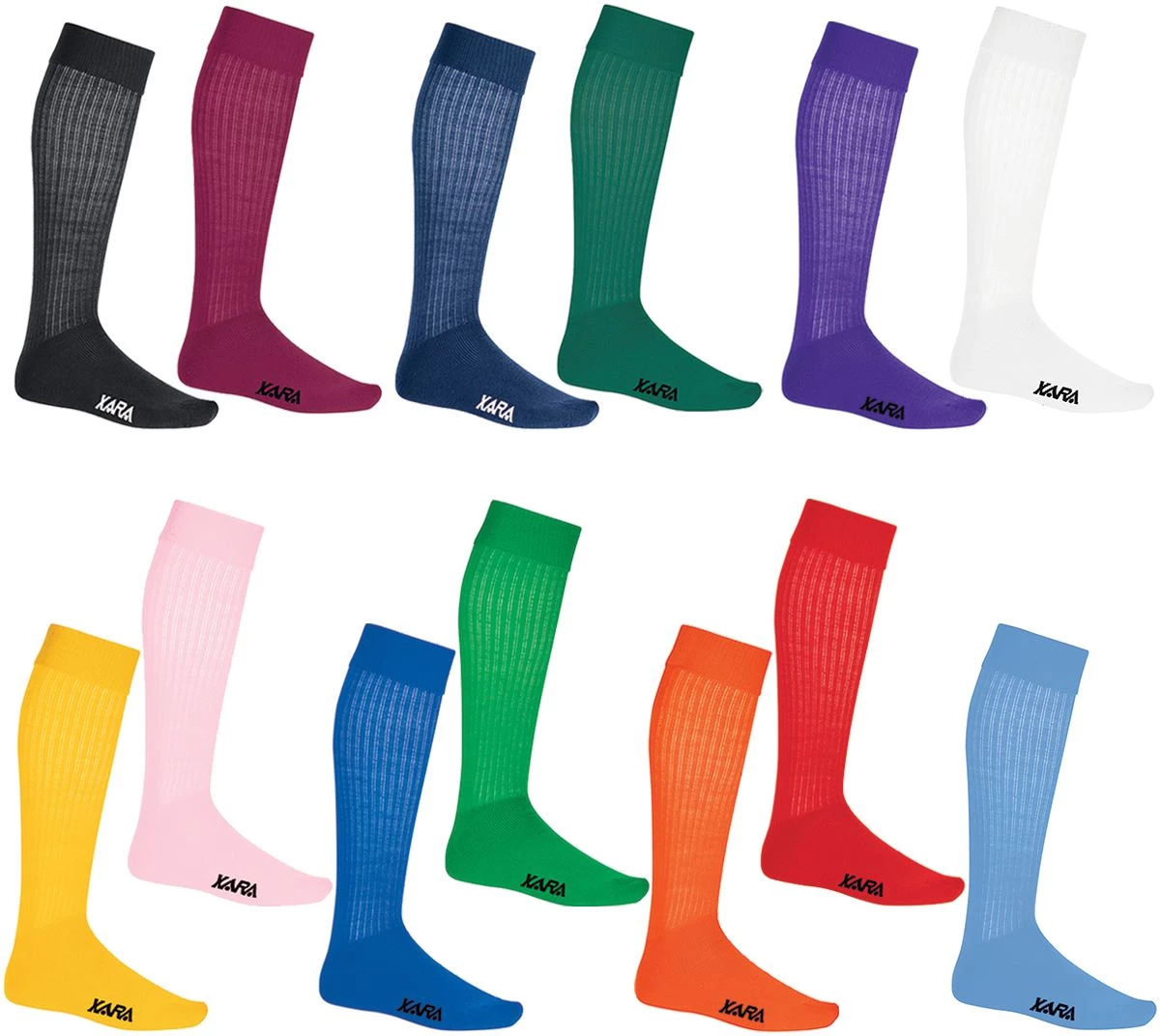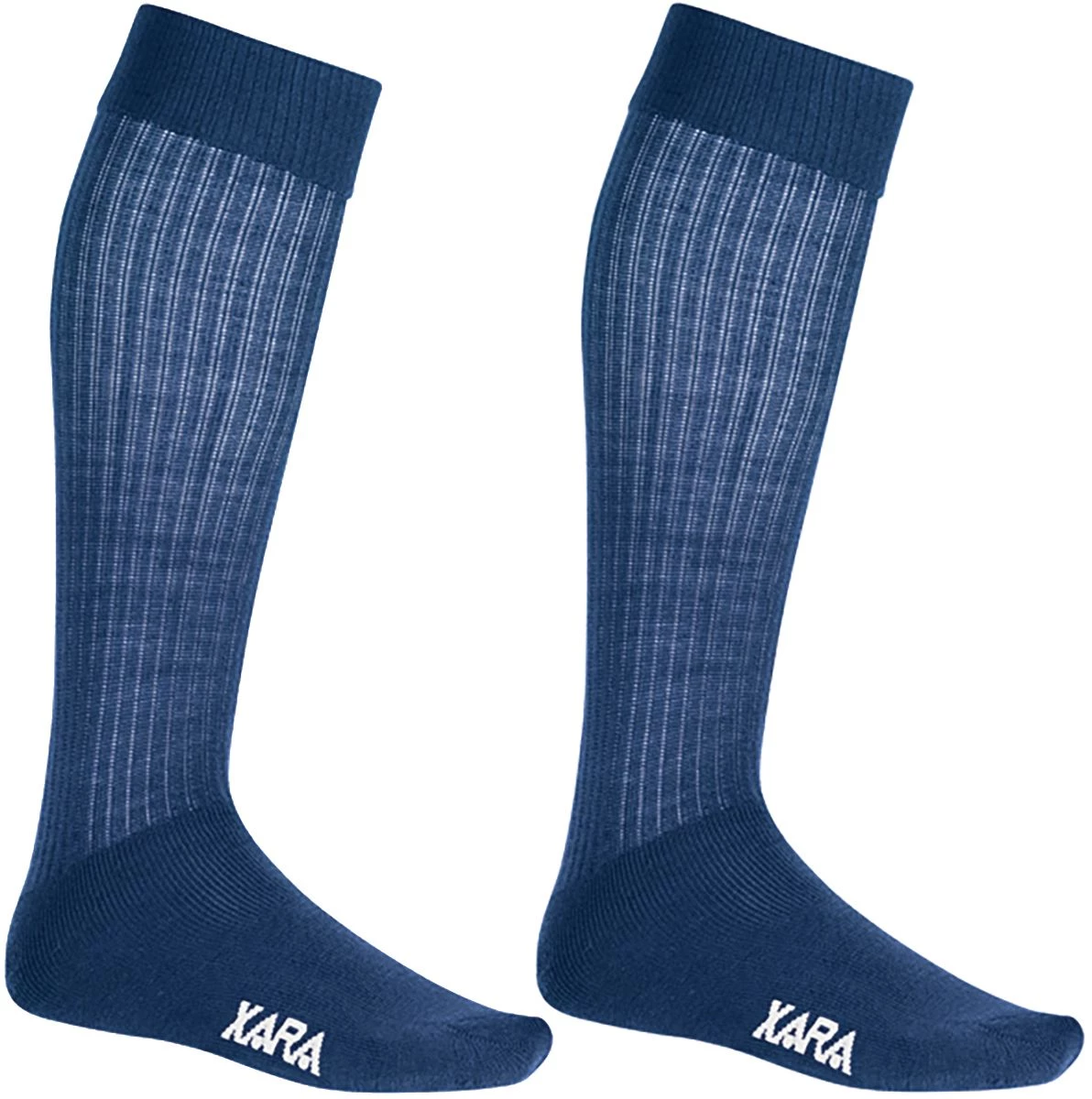The Xara adult League soccer socks have an acrylic and spandex construction for comfort and durability.