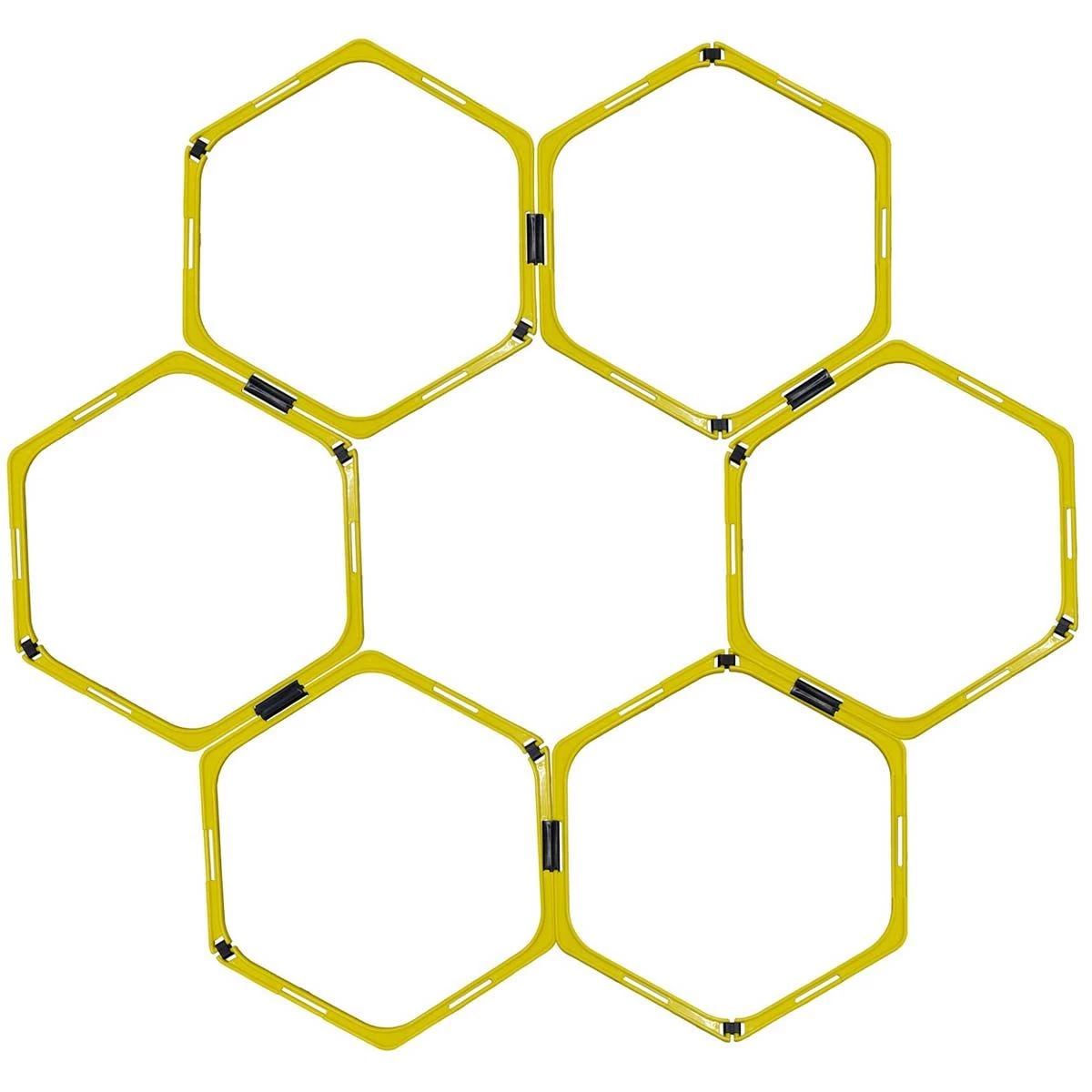 The Kwik Goal Hex speed rings set is a multi-purpose speed and agility training tool designed to improve footwork and explosive movement on the field. This versatile training aid can be configured as speed rings, 9″ hurdles, and as an agility ladder giving you access to multiple exercises and saving space in your coaching bag. The set includes 6 hexagonal rings, connecting clips, hurdle bars, and a carry bag. The rings are built with high impact PVC that is durable for use on any surface. To build a hex ring, connect two half rings with the small connector clips. Use the large connector clips to connect multiple hex rings to create your own speed and agility course. The long connector clips also give the option to use a 9” hurdle.