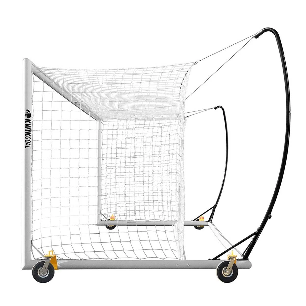 The Kwik Goal Pro Premierยฎ portable competition goal features a 4 3/8โ aluminum round post/crossbar and removable swivel wheels making the goal easy to maneuver on the field. The portable design is ideal for the facility that wants an international goal look but cannot sink ground sleeves into the field. The Pro Premierยฎ features a durable all-aluminum base-frame with a knob tension system on the back posts that allows the goal to maintain its shape. This goal ships complete with 6 saddle anchor bags and 4 semi-permanent ground anchors, keeping the goal secure on the turf. A set of Kwik Lockยฎ net clips is also included to keep the net in place. This pro premierยฎ portable competition goal meets the ASTM safety standard F2950-14 for soccer goals. Get it for your soccer facility today!